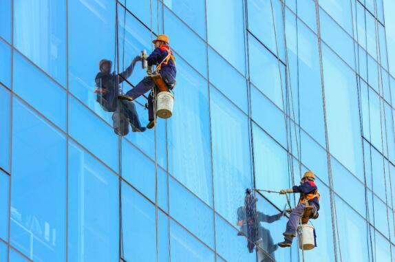 萬(wàn)達(dá)廣場(chǎng)為了以嶄新的面貌迎接國(guó)慶的到來(lái),對(duì)大廈玻璃進(jìn)行清潔作業(yè)。大廈樓層較高,工作在高空進(jìn)行清潔作業(yè)時(shí)佩帶防墜器、安全繩、安全帶、安全帽等保護(hù)裝備,由頂部的吊運(yùn)機(jī)進(jìn)行操控,工人緩慢的進(jìn)行下降作業(yè),對(duì)樓層玻璃進(jìn)行清潔。