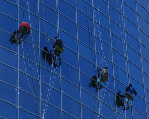 大廈清潔工人都是經過專業培訓的高空操作工人,他們利用臺灣防墜器、安全繩、安全帶、高空坐板自上而下的對大廈外部玻璃進行刷洗清潔工作。大廈清潔工人在作業時每人負責一小塊區域,不能隨意晃動以防發生高空墜落的危險。